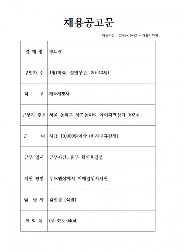 PHOTO & GALLERY채용정보 렁트멍 제과제빵사 모집 최고관리자 메일보내기 아이디로 검색 0 29,203 2019.10.22 10:21 짧은주소 - 짧은주소: https://www.kib.or.kr:443/bbs/?t=3q9 주소복사 × 짧은 글주소 복사 Note! 위 주소를 드래그, 복사(Ctrl+C)하여 사용하세요. 이전글다음글 목록 본문 채용공고 자세히 보기 댓글목록 등록된 댓글이 없습니다.