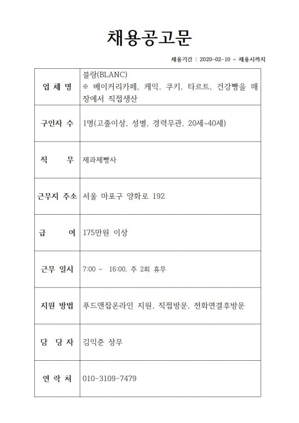 PHOTO & GALLERY채용정보 홍대 베이커리카페 BLANC 생산직 채용 최고관리자 메일보내기 아이디로 검색 0 24,593 2020.02.11 19:06 짧은주소 - 짧은주소: https://www.kib.or.kr:443/bbs/?t=28h 주소복사 × 짧은 글주소 복사 Note! 위 주소를 드래그, 복사(Ctrl+C)하여 사용하세요. 이전글다음글 목록 본문 https://www.foodnjob.com/cms/s01_v.php?idx=196052 댓글목록 등록된 댓글이 없습니다.